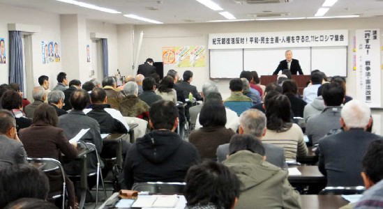 「戦争をさせない1000人委員会」の呼びかけで、2月11日、10時より自治労会館3階ホール(広島市西区横川)で、「紀元節復活反対!平和・民主主義・人権を守る 2.11 ヒロシマ集会」が開催され137名が参加しました。
