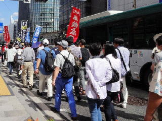 とうかさんでゆかた姿の買い物客であふれるなか、個人のプライバシー侵害や冤罪を生む共謀罪の危険性を訴え、道行く市民に反対の協力の要請を行いました。