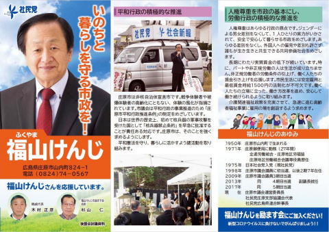 4月4日告示、11日投開票で行われた庄原市議会議員選挙では、福山けんじ候補に寄せられた力強いご支援のもと、6位(1120票)で当選を果たせました。