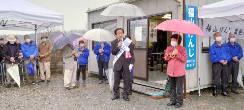 4月4日(日)朝9時より、時折り激しい雨が降る中、福山けんじ選挙事務所前にて地元支援者・支援団体から105人の参加者を迎え盛大に出発式が行われました。