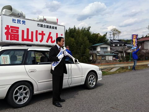 4月4日に告示された庄原市議会議員選挙は、定数20に対して23人が立候補し厳しい選挙戦ですが、これまで寄せられたみなさまからのご期待に応えるべく、福山けんじ候補は市内各地を全力で遊説中です。